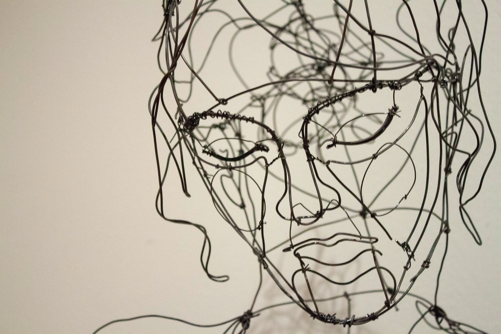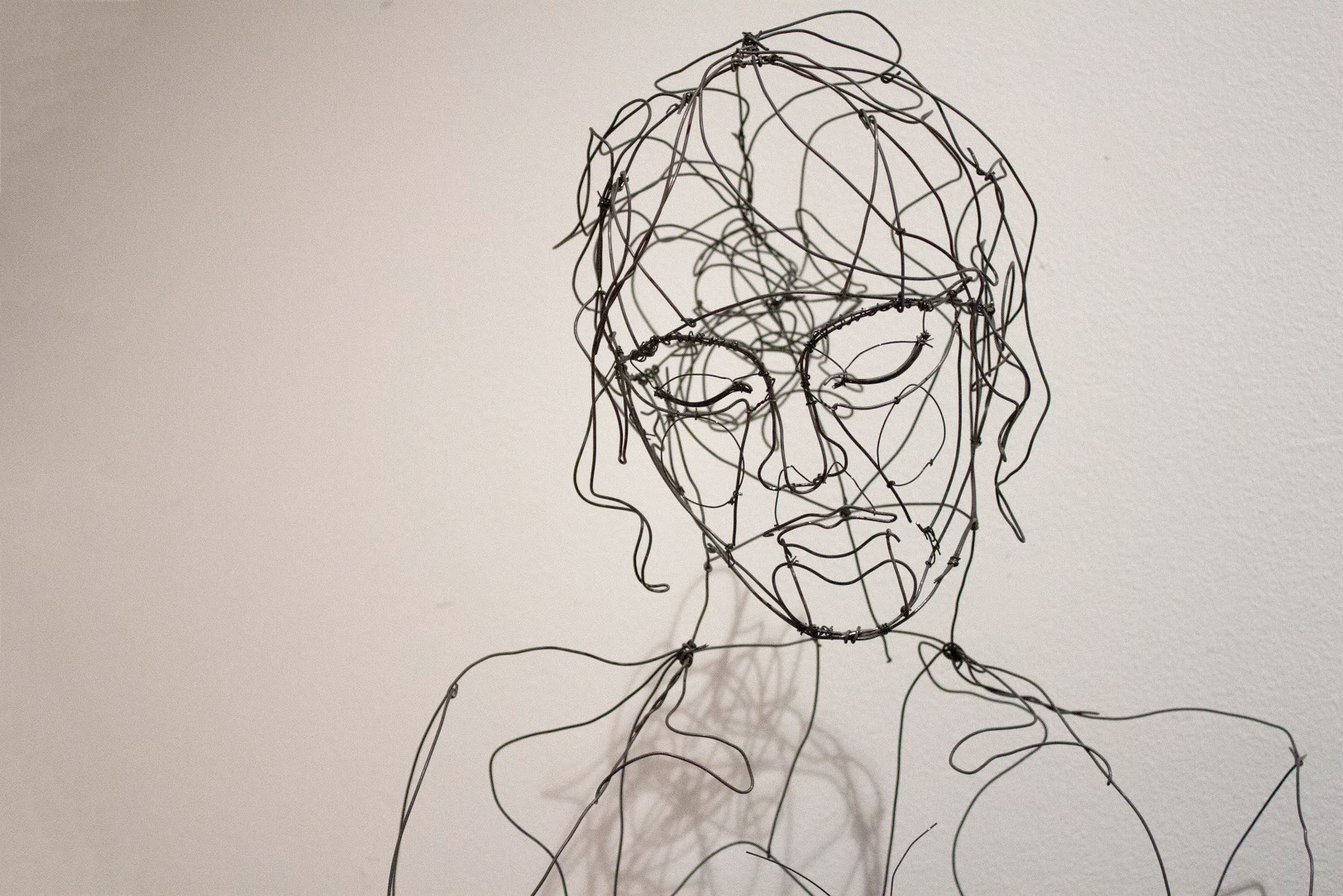 Beginning with the eyes, nose and mouth, I began adding different widths of wire to emphasize part of the face. Building outward I added the jawline, ears, hair and bust.